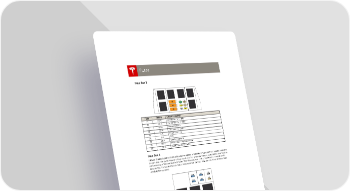 book.book Page 22 Friday, July 19, 2013 12:53 PM Fuses Fuses Fuse Box 3 Fuse Rating Circuit Protected 71 40 A Condenser fan (left) 72 40 A Condenser fan (right) 73 40 A Vacuum pump 74 20 A 12V drive rail (cabin) 75 5 A Power steering 76 5 A ABS 77 25 A Stability control 78 20 A Headlights - high/low beam 79 30 A Light - exterior/interior Fuse Box 4 If Model S is equipped with the cold weather option, an additional fuse box (4) is located under the driver’s side trim panel. Access to fuse box 4 requires removal of several components that must be performed by a Tesla service technician. The following fuse list is provided only to assist you in determining if a fuse in this box needs to be replaced. Contact Tesla Service if one of these fuses needs to be replaced. Fuse Rating Circuit Protected NOTE: THESE FUSES MUST BE REPLACED BY A TESLA SERVICE TECHNICIAN 101 15 A Left rear seat heater 102 15 A Right rear seat heater 103 15 A Middle rear seat heater control 104 15 A Middle rear seat heater 105 15 A Wiper de-icer 106 - Not used 7.22 MODEL S OWNERS MANUAL