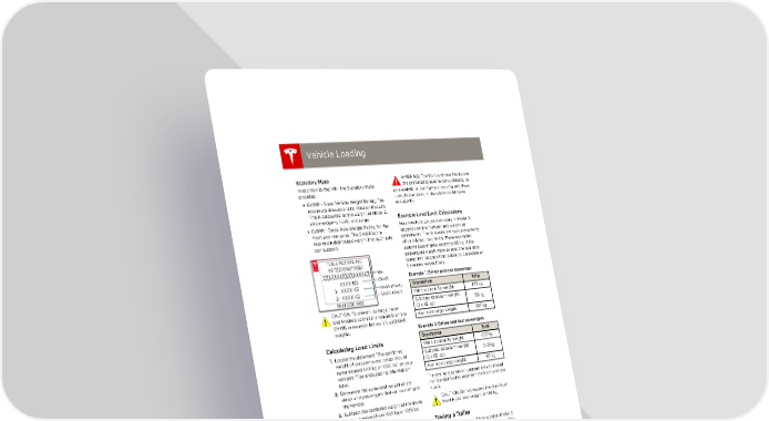 book.book Page 4 Friday, July 19, 2013 12:53 PM Vehicle Loading Vehicle Loading Statutory Plate WARNING: The front and rear trunks are In addition to the VIN, the Statutory Plate the preferred places to carry objects. In provides: an accident, or during hard braking and sharp • GVWR - Gross Vehicle Weight Rating. The turns, loose items in the cabin could injure maximum allowable total mass of Model S. occupants. This is calculated as the weight of Model S, Example Load Limit Calculations all passengers, fluids, and cargo. • GAWR - Gross Axle Weight Rating for the How much cargo you can carry in Model S front and rear axles. The GAWR is the depends on the number and weight of maximum distributed weight that each axle passengers. The following are typical examples can support. of calculated load limits. These examples assume passengers weighing 68 kg. If the passengers weigh more or less, the available cargo and luggage load capacity decreases or increases respectively. Example 1: Driver and one passenger Description Total Vehicle capacity weight 433kg Subtract occupant weight 136 kg CAUTION: To prevent damage, never (2 x 68 kg) load Model S so that it is heavier than the Available cargo weight 297 kg GVWR or exceeds the individual GAWR weights. Example 2: Driver and four passengers Calculating Load Limits Description Total Vehicle capacity weight 433kg 1. Locate the statement “The combined Subtract occupant weight weight of occupants and cargo should (5 x 68 kg) 340kg never exceed XXX kg or XXX lbs” on your vehicle’s “Tire and Loading Information” Available cargo weight 93 kg label. The available cargo or luggage weight should 2. Determine the combined weight of the then be distributed between the front and rear driver and passengers that will be riding in trunks. the vehicle. 3. Subtract the combined weight of the driver CAUTION: Do not exceed the maximum and passengers from XXX kg or XXX lbs front trunk load weight of 136 kg. (see Step 1). 4. The resulting figure equals the available Towing a Trailer amount of cargo and luggage load WARNING: Do not tow a trailer. Model S capacity. For example, if the “XXX” amount does not support a trailer hitch. Installing equals 635 kg, and there will be five 68 kg one could damage Model S and increase the passengers in the vehicle, the amount of risk of an accident. available cargo and luggage capacity is 294 kg (635-340 (5x68)=294 kg). 5. Determine the combined weight of cargo and luggage being loaded on the vehicle. That weight must not exceed the available cargo and luggage load capacity calculated in Step4. 8.4 MODEL S OWNERS MANUAL