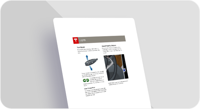 book.book Page 14 Friday, July 19, 2013 12:53 PM Lights Lights Turn Signals Hazard Warning Flashers Move the left-hand steering column lever up Press the switch located to the left of the (before turning right) or down (before turning touchscreen to turn on the hazard warning left). flashers. All turn signals flash. Press again to turn off. The turn signals stop operating when canceled by the steering wheel, or when you return the lever to the central position. The corresponding turn signal indicator displays on the instrument panel when a turn signal is operating. You also hear a clicking sound. NOTE: Hazard warning flashers operate even Lane Change Flash without a recognized key nearby. To indicate a lane change, quickly press the lever up or down against the spring pressure, then release. The corresponding turn signal flashes three times. 4.14 MODEL S OWNERS MANUAL