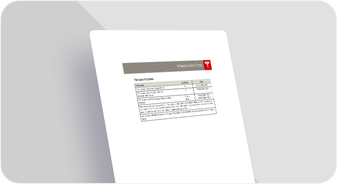 book.book Page 9 Friday, July 19, 2013 12:53 PM Wheels and Tires Tire Specifications Tire Type Location Size 19” wheels: Goodyear Eagle RS-A2 All P245/45R19 98V 21” wheels on standard vehicles: All P245/35R21 96Y Michelin Pilot Sport 21” wheels on Performance Plus vehicles: Front P245/35R21 96Y Michelin Rear P265/35R21 101Y Tire pressures vary depending on the type of tires fitted on Model S. Refer to the tire pressures printed on the Tire and Loading Information label. This label is located on the driver’s door pillar and is visible when the driver’s door is open (see page 7.3). Winter tires (Pirelli Sottozero or Nokian Studded - P245/45R19) can be purchased from a Tesla store. SPECIFICATIONS 8.9