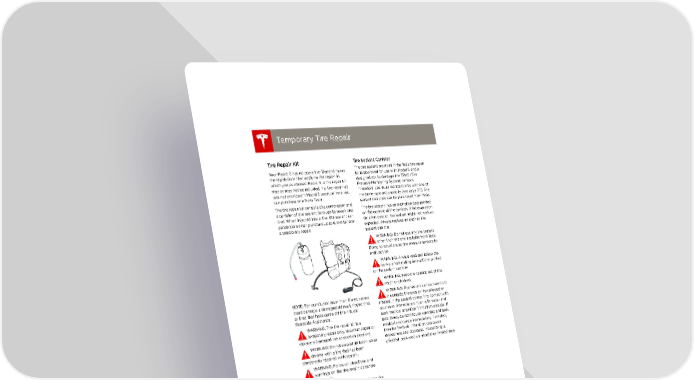book.book Page 8 Friday, July 19, 2013 12:53 PM Temporary Tire RepairTemporary Tire Repair Temporary Tire Repair Tire Sealant Canister Tire Repair Kit Your Model S has no spare tire. Depending on The tire sealant provided in the Tesla tire repair the legislations that apply to the region in kit is approved for use with Model S and is which you purchased Model S, a tire repair kit designed not to damage the TPMS (Tire may or may not be included. If a tire repair kit Pressure Monitoring System) sensors. was not provided in Model S upon delivery, you Therefore, you must replace it only with one of can purchase one from Tesla. the same type and capacity (see page 7.11). Tire sealant canisters can be purchased from Tesla. The tire repair kit consists of a compressor and The tire sealant has an expiration date printed a canister of tire sealant (enough to repair one on the outside of the canister. If the expiration tire). When injected into a tire, the sealant can date has passed, the sealant might not work as penetrate a small puncture up to 6 mm to form expected. Always replace an expired tire a temporary repair. sealant canister. WARNING: Do not use any tire sealant other than the one available from Tesla. Doing so could cause tire pressure sensors to malfunction. WARNING: Always read and follow the safety and handling instructions printed on the sealant canister. WARNING: Keep tire sealant out of the reach of children. WARNING: Tire sealant can be harmful if NOTE: For punctures larger than 6 mm, severe it contacts the eyes or if swallowed or tread damage, a damaged sidewall, ripped tires inhaled. If the sealant comes into contact with or tires that have come off the rim, call your eyes, immediately flush with water and Roadside Assistance. seek medical attention if irritation persists. If WARNING: The tire repair kit is a swallowed, do not induce vomiting and seek temporary repair only. You must repair or medical assistance immediately. If inhaled, replace a damaged tire as soon as possible. breathe fresh air. Inhalation can cause WARNING: Do not exceed 48 km/h when drowsiness and dizziness. If breathing is driving with a tire that has been affected, seek medical assistance immediately. temporarily repaired with sealant. WARNING: Follow all directions and warnings on the tire repair kit before starting a repair. CAUTION: Do not drive on a deflated tire as this can cause serious damage. 7.8 MODEL S OWNERS MANUAL