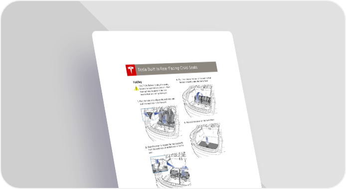 book.book Page 12 Friday, July 19, 2013 12:53 PM Tesla Built In Rear Facing Child Seats Tesla Built In Rear Facing Child Seats Folding 4. Pull the strap at the rear of the seat to fold CAUTION: Before folding the seats, the seat assembly into the trunk floor: fasten the seat belts to prevent them from getting trapped in the seat mechanism and being damaged. 1. Pull the handle to release the seat back and pull the seat back fully forward: 5. Replace the cover on the trunk floor: 2. Push the lever to release the head supports from the seat back, then fold back onto the seat: 3. Secure the Velcro strap: 3.12 MODEL S OWNERS MANUAL