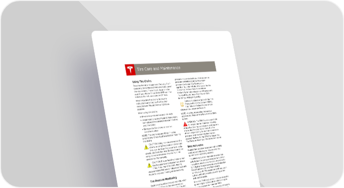 book.book Page 6 Friday, July 19, 2013 12:53 PM Tire Care and Maintenance Tire Care and Maintenance Using Tire Chains pressure, stop and check your tires as soon as Tesla has tested and approved Security Chain possible, and inflate them to the proper Company (SCC) Model Z-563 chains for use on pressure (see page 7.3). Driving on a the rear wheels. These chains must only be significantly under-inflated tire causes the tire used if your Model S has 245/45R19 rear tires to overheat and can lead to tire failure. installed. Do not use chains on 21” tires. Under-inflation also reduces fuel efficiency and tire tread life, and may affect the vehicle's When installing tire chains, follow the handling and stopping ability. instructions provided by the tire chain If Model S detects a fault with the Tire manufacturer. Mount them as tightly as Pressure Monitoring System (TPMS), possible. this indicator flashes for one minute When using tire chains: whenever you power on Model S. • Drive slowly—do not exceed 48 km/h. NOTE: Installing accessories that are not • Avoid heavily loading Model S (heavy loads approved by Tesla can interfere with the TPMS can reduce the clearance between the tires system. and the body). WARNING: The TPMS is not a substitute • Remove the tire chains as soon as for proper tire maintenance, including conditions allow. manually checking tire pressures and regularly NOTE: Tire chains are prohibited in some inspecting the condition of tires. It is the jurisdictions. Check local laws before installing driver's responsibility to maintain correct tire tire chains. pressure, even if under-inflation has not CAUTION: Using non-recommended tire reached the level for the TPMS to trigger the chains, or using tire chains on other sized Tire Pressure Warning on the instrument panel. tires, can damage the suspension, body, TPMS Malfunction wheels, and/or brake lines. Damage caused by using non-recommended tire chains is not ModelS has also been equipped with a TPMS covered by the warranty. malfunction indicator to indicate when the CAUTION: Ensure that tire chains cannot system is not operating properly. touch suspension components or brake The TPMS malfunction indicator is combined lines. If you hear the chains making with the low tire pressure indicator light. When unusual noises that would indicate contact with the system detects a malfunction, the indicator ModelS, stop and investigate immediately. light flashes for approximately one minute after ModelS powers on, and then remains Tire Pressure Monitoring continuously lit. This sequence continues upon subsequent vehicle start-ups as long as the Each tire should be checked monthly when malfunction exists. cold and inflated to the recommended When the TPMS malfunction indicator is on, the pressures that are printed on the Tire and system might not be able to detect or signal Loading Information label located on the low tire pressure as intended. TPMS driver’s door pillar (see page 7.3). If your malfunctions can occur for a variety of reasons, vehicle has tires of a different size than the size including installing replacement or alternate indicated on the vehicle placard or tire inflation tires or wheels on the vehicle that prevent the pressure label, determine the proper tire TPMS from functioning properly. Always check inflation pressure for those tires. the TPMS malfunction indicator light after As an added safety feature, your vehicle has replacing one or more tires or wheels on your been equipped with a tire pressure monitoring vehicle to ensure that the replacement or system (TPMS) that displays a low tire pressure alternate tires and wheels allow the TPMS to telltale (Tire Pressure Warning) on the continue to function properly. instrument panel when one or more of your NOTE: If a tire has been replaced or repaired tires is significantly under-inflated. Accordingly, using a different tire sealant than the one when the Tire Pressure indicator light displays available from Tesla, and a low tire pressure is on the instrument panel alerting you of low tire 7.6 MODEL S OWNERS MANUAL