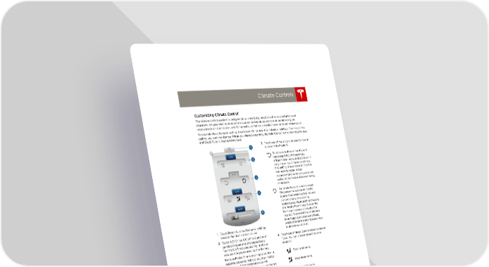 book.book Page 9 Friday, July 19, 2013 12:53 PM Climate Controls Customizing Climate Control The climate control system is designed to automatically provide optimum comfort in most situations. All you need to do is set the desired temperature, and the air conditioning, air recirculation, air distribution, and fan speed automatically maintain your selected temperature. To override the automatic setting, touch Auto On to view the individual settings. Then touch the setting you want to change. When you change a setting, the Auto On icon turns from blue to gray and Reset Auto is displayed instead. 3. Touch one of these icons to specify how air is drawn into Model S: Outside air is drawn into Model S (see page 5.10). Although less efficient than recirculating the air in very hot or low climate conditions, this setting draws more air into the rear seating areas, and is recommended when occupants are seated in the Tesla built in rear facing child seats. Air inside Model S is recirculated. This prevents outside air (traffic fumes) from entering but reduces dehumidifying and cooling performance. Recirculating the air is the most efficient way to cool the front cabin area but it is also the loudest. To prevent the windshield from fogging in some conditions, 1. Touch Reset Auto to change all settings briefly change the setting every hour back to the their default values. to draw in outside air. 2. Touch A/C On or A/C off to turn the air 4. Touch one of these icons to select where air conditioning on and off, respectively. flows. You can choose more than one Turning it off reduces cooling, and also location: reduces the power used by the Battery. Because Model S runs much quieter than a Foot-level vents gasoline-powered vehicle, you may notice the sound of the compressor as it is Face-level vents operating. To minimize noise, reduce the fan speed or recirculate the air. NOTE: Turning off air conditioning can Windshield vents cause the windows to fog in some climate conditions. 5. Touch and drag the slider to set the speed of the fan. NOTE: In high temperatures, it is more efficient to operate the fan at a higher speed. Doing so reduces the amount of power needed by the air conditioning system. USING THE TOUCHSCREEN 5.9