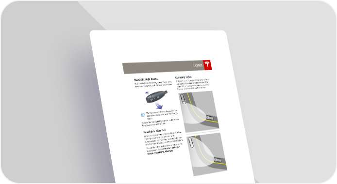 book.book Page 13 Friday, July 19, 2013 12:53 PM Lights Headlight High Beams Cornering Lights Push the left-hand steering column lever away If Model S is equipped with the optional tech from you. To cancel, pull the lever toward you. package, LED cornering lights broaden the beam of the headlights whenever you drive through a corner at 40 km/h or slower. The high beam indicator displays on the instrument panel whenever high beams are on. To flash the headlight high beams, pull the lever fully toward you and release. Headlights After Exit When you stop driving and park Model S in low lighting conditions, the exterior lights automatically turn on. They automatically turn off after two minutes or when you lock Model S. You can turn this feature on and off using the touchscreen. Touch Controls > Settings > Vehicle > Headlights After Exit. DRIVING 4.13