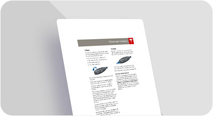 book.book Page 15 Friday, July 19, 2013 12:53 PM Wipers and Washers Wipers and Washers Wipers Washers To wipe the windshield, rotate the end of the Press and hold the button on the end of the left-hand steering column lever away from you. left-hand steering column lever to spray washer You can choose from four levels: fluid onto the windshield. The wipers turn on. • 1st: Auto with low rain sensitivity.* • 2nd: Auto with high rain sensitivity.* • 3rd: Continuous, slow. • 4th: Continuous, high. When you release, the wipers turn off after wiping the windshield a couple more times. Periodically top up washer fluid (see page 7.18). De-icing Washer Nozzles For a single wipe, press and release the end of If Model S is equipped with the cold weather the lever. option, washer nozzles have de-icers that turn If the wipers are set to Auto and the sensor on whenever the ambient temperature nears detects no water, the wipers do not wipe. freezing, or when you turn on the heated wipers When you operate the wipers, headlights (Controls > Cold Weather > Heated Wipers). automatically turn on (if they are not on The washer de-icers turn off when the heated already). wipers turn off (after 15 minutes), provided the *Model S has a rain sensor located on the inside temperature is warm enough to prevent of the windshield at the base of the interior freezing. mirror. When wipers are set to Auto, the frequency at which they wipe depends on how much water the sensor detects. When wipers are set to the 2nd level, the sensor is more sensitive. To extend the life of wiper blades, remove ice from the windshield before turning wipers on. Ice has sharp edges that can damage the rubber on the blades. Periodically check and clean the edge of the wiper blade. If damaged, replace the blade immediately. For details on checking replacing wiper blades, see page 7.15. CAUTION: In harsh climates, ensure that the wiper blades are not frozen or adhered to the windshield. De-icing Wipers If Model S is equipped with the cold weather option, you can de-ice wipers by touching Controls > Cold Weather > Heated Wipers. This control heats the wipers for 15 minutes and then automatically turns off. DRIVING 4.15