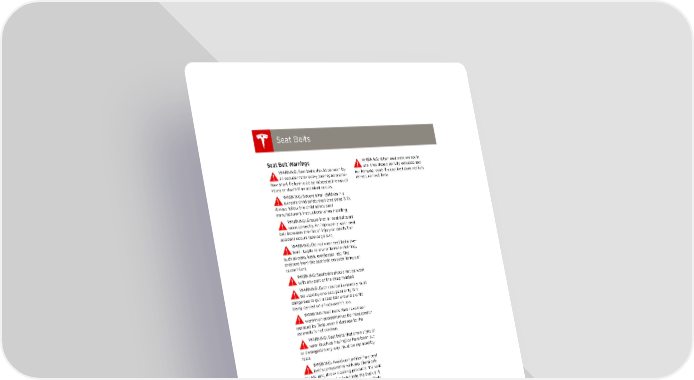 book.book Page 6 Friday, July 19, 2013 12:53 PM Seat Belts Seat Belts Seat Belt Warnings WARNING: When seat belts are not in WARNING: Seat belts should be worn by use, they should be fully retracted and all occupants for every journey no matter not hanging loose. If a seat belt does not fully how short. Failure to do so increases the risk of retract, contact Tesla. injury or death if an accident occurs. WARNING: Secure small children in a suitable child safety seat (see page 3.7). Always follow the child safety seat manufacturer's instructions when installing. WARNING: Ensure that all seat belts are worn correctly. An improperly worn seat belt increases the risk of injury or death if an accident occurs (see page 3.4). WARNING: Do not wear seat belts over hard, fragile or sharp items in clothing, such as pens, keys, eyeglasses, etc. The pressure from the seat belt on such items can cause injury. WARNING: Seat belts should not be worn with any part of the strap twisted. WARNING: Each seat belt assembly must be used by one occupant only. It is dangerous to put a seat belt around a child being carried on an occupant’s lap. WARNING: Seat belts that have been worn in an accident must be inspected or replaced by Tesla, even if damage to the assembly is not obvious. WARNING: Seat belts that show signs of wear (such as fraying) or have been cut or damaged in any way, must be replaced by Tesla. WARNING: Avoid contaminating a seat belt’s components with any chemicals, liquids, grit, dirt or cleaning products. If a seat belt fails to retract or latch into the buckle, it must be replaced immediately. Contact Tesla. WARNING: Do not make modifications or additions that can prevent a seat belt mechanism from taking up slack, or that can prevent a seat belt from being adjusted to remove slack. A slack belt greatly reduces occupant protection. WARNING: Do not make modifications that can interfere with the operation of a seat belt, or that can cause a seat belt to become inoperable. 3.6 MODEL S OWNERS MANUAL