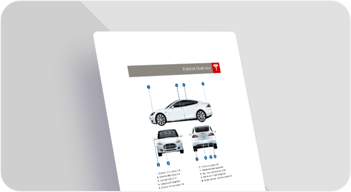 book.book Page 3 Friday, July 19, 2013 12:53 PM Exterior Overview Exterior Overview 1. Exterior lights (page 4.11) 6. Front trunk (page 2.10) 2. Door handles (page 2.4) 7. Wheels and tires (page 8.8) 3. Sunroof (page 2.12) 8. Rear view camera (page 4.24) 4. Charge port (page 6.5) 9. Rear trunk/liftgate (page 2.8) 5. Exterior mirrors (page 4.5) 10. Parking sensors - optional (page 4.16) OVERVIEW 1.3