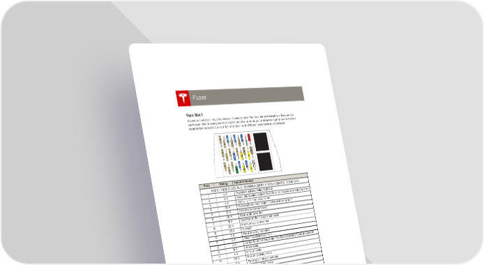 book.book Page 20 Friday, July 19, 2013 12:53 PM Fuses Fuses Fuse Box 1 Access to fuse box 1 requires removal of components that must be performed by a Tesla service technician. The following fuse list is provided only to assist you in determining if a fuse in this box needs to be replaced. Contact Tesla Service if one of these fuses needs to be replaced. Fuse Rating Circuit Protected NOTE: THESE FUSES MUST BE REPLACED BY A TESLA SERVICE TECHNICIAN 1 5 A Accessory sensor, radio, USB hub 2 5 A Headlight leveling system (EU/China Coil Suspension vehicles only) 3 5 A Vanity lights, rear view mirror 4 30 A Outboard rear seat heaters (cold weather option) 5 15 A Seat heater (driver’s seat) 6 20 A Base audio amplifier 7 15 A Seat heater (front passenger seat) 820 APremium audio amplifier 9 25 A Sunroof 10 5 A Passive safety restraints 11 5 A Steering column controls 12 5 A Sensor for Drive mode and Yaw Rate (Stability/Traction Control) 13 15 A Wiper park 14 5 A Drive inverter 15 20 A Electric parking brake 16 5 A Parking/blind spot sensors 17 20 A Electric parking brake 18 5 A Not used 19 5 A In-vehicle HVAC sensor 20 5 A Cabin air heater logic 21 15 A Battery coolant pump 1 22 5 A Inlet actuators 23 15 A Powertrain coolant pump 24 5 A Cabin climate control 25 15 A Battery coolant pump 2 26 - Not used 27 10 A Thermal controller 7.20 MODEL S OWNERS MANUAL