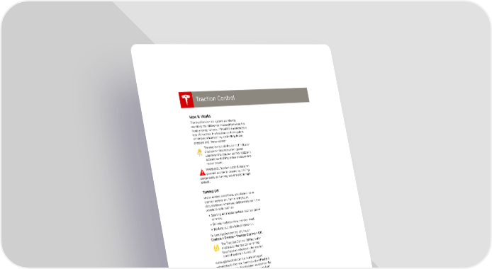 book.book Page 22 Friday, July 19, 2013 12:53 PM Traction Control Traction Control Traction Control How It Works The traction control system constantly monitors the difference in speed between the front and rear wheels. If Model S experiences a loss of traction, the traction control system minimizes wheel spin by controlling brake pressure and motor power. The electronic stability control indicator displays on the instrument panel whenever the traction control system is actively controlling brake pressure and motor power. WARNING: Traction control does not prevent accidents caused by driving dangerously or turning too sharply at high speeds. Turning Off Under normal conditions, you should leave traction control on. Turn it off only in circumstances where you deliberately want the wheels to spin, such as: • Starting on a loose surface, such as gravel or snow. • Driving in deep snow, sand or mud. • Rocking out of a hole or deep rut. To turn traction control off, touch Controls > Driving > Traction Control > Off. The Traction Control Off indicator TC displays at the top center of the touchscreen whenever the traction control system is turned off. Although traction control turns on again automatically the next time you start Model S, turn it on using the touchscreen as soon as the circumstances that required you to turn it off have passed. 4.22 MODEL S OWNERS MANUAL