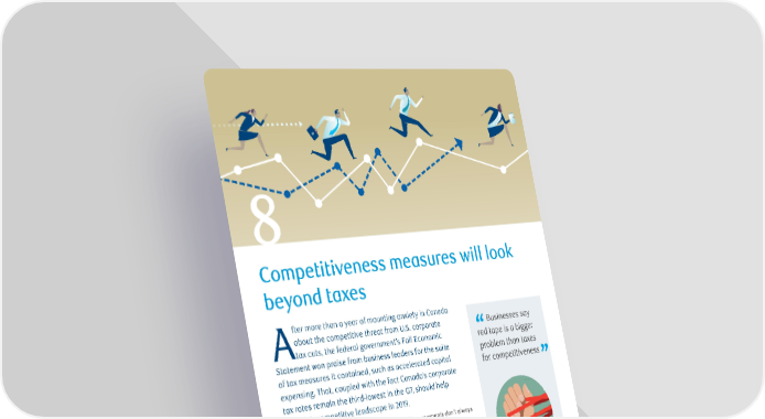 8 Competitiveness measures will look beyond taxes fter more than a year of mounting anxiety in Canada about the competitive threat from U.S. corporate Businesses say Atax cuts, the federal government’s Fall Economic “ red tape is a bigger Statement won praise from business leaders for the suite problem than taxes of tax measures it contained, such as accelerated capital for competitiveness expensing. That, coupled with the fact Canada’s corporate ” tax rates remain the third-lowest in the G7, should help Canada’s competitive landscape in 2019. But competitiveness is not all about taxation, and improvements don’t always have to cut drastically into government revenues. Inefficient government bureaucracy ranks above tax rates as a “problematic factor for doing busi- ness” in Canada, according to the World Economic Forum. Consider the aver- age time it takes to deal with construction permits: at 250 days, according to World Bank data, the process takes longer than in any other G7 country, and almost three times as long as in the U.S. The seemingly endless process to get new oil pipelines built to alleviate Canada’s oil transportation bottlenecks is another example. RBC Economics Research | Navigating 2019 - 9 big insights for the year ahead | January 2019 19