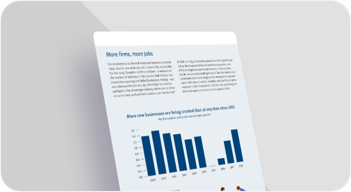 More firms, more jobs For an economy to thrive it needs entrepreneurs to take of 2018 running at its fastest pace since 2012. Growth was risks, launch new ventures and, importantly, create jobs. led by the transportation and warehousing sector, one For too long, Canada’s net firm creation – a measure of of the strongest economic performers in recent years. the number of business in the country that reflects new And for an economy looking forward, the information and enterprises opening and failed businesses closing – was communications technology sector emerged as a growth on a downward trajectory. By 2015 it flat-lined amid a star in 2018. Need another reminder why net firm creation pullback in the oil and gas industry. We’ve seen a recov- matters? In 2017, it resulted in 100,000 new jobs being cre- ery since then, with net firm creation over the first half ated, and was on track for a similar gain in 2018. More new businesses are being created than at any time since 2012 Net firm creation (entry rate less exit rate), percent 1.6 1.4 1.2 1.0 0.8 0.6 0.4 0.2 0.0 2009 2010 2011 2012 2013 2014 2015 2016 2017 2018 Source: Statistics Canada, RBC Economics Research In 2017, net firm creation resulted “ in 100,000 new jobs being created, and was on track for a similar gain in 2018. ” RBC Economics Research | Navigating 2019 - 9 big insights for the year ahead | January 2019 21