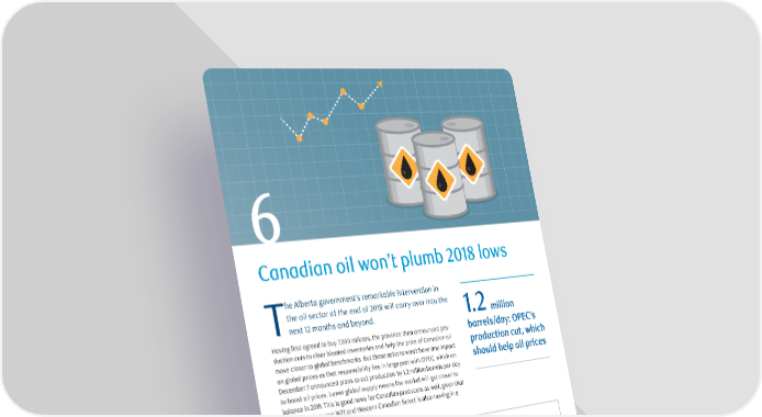 6 Canadian oil won’t plumb 2018 lows he Alberta government’s remarkable intervention in the oil sector at the end of 2018 will carry over into the Tnext 12 months and beyond. 1.2 million Having first agreed to buy 7,000 railcars, the province then announced pro- barrels/day: OPEC’s duction cuts to clear bloated inventories and help the price of Canadian oil production cut, which move closer to global benchmarks. But these actions won’t have any impact on global prices as that responsibility lies in large part with OPEC, which on should help oil prices December 7 announced plans to cut production by 1.2 million barrels per day to boost oil prices. Lower global supply means the market will get closer to balance in 2019. This is good news for Canadian producers as well, given that the spread between WTI and Western Canadian Select is also moving in a positive direction. The price gap between Canadian and international oil 50 $US per barrel 40 Differential between WCS and WTI 30 price, in US$ per barrel 20 10 0 2010 2012 2013 2014 2015 2016 2017 2018 Source: Bloomberg, RBC Economics Research RBC Economics Research | Navigating 2019 - 9 big insights for the year ahead | January 2019 16