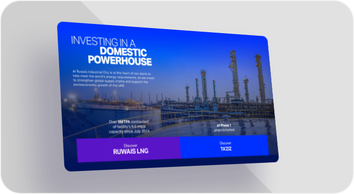 INVESTING IN A DOMESTIC POWERHOUSE Al Ruwais Industrial City is at the heart of our plans to help meet the worlds energy requirements, as we invest to strengthen global supply chains and support the socioeconomic growth of the UAE. Discover RUWAIS LNG Over 8MTPA contracted of facilitys 9.6 mtpa capacity since July 2024 all Phase 1 projects locked Discover TAZIZ