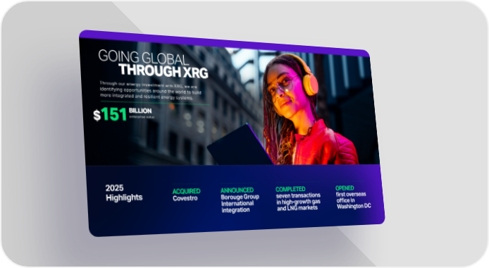 2025 Highlights GOING GLOBAL THROUGH XRG Through our energy investment arm XRG, we are identifying opportunities around the world to build more integrated and resilient energy systems. BILLION enterprise value ACQUIRED Covestro ANNOUNCED Borouge Group International integration OPENED first overseas office in Washington DC COMPLETED seven transactions in high-growth gas and LNG markets $ 151