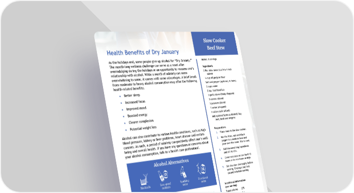 Health Benefits of Dry January As the holidays end, some people give up alcohol for “Dry January.” Makes: 6 servings The month-long wellness challenge can serve as a reset after Ingredients overindulging during the holidays or an opportunity to reassess one’s 2 lbs. stew meat (cut into 1-inch relationship with alcohol. While a month of sobriety can seem cubes) overwhelming to some, it comes with some advantages. A brief break ¼ cup all-purpose flour from moderate to heavy alcohol consumption may offer the following Salt and pepper (optional, to taste) health-related benefits: 2 cups water • Better sleep 2 tsp. beef bouillon • Increased focus 1 garlic clove (finely chopped) 3 carrots (sliced) • Improved mood 3 potatoes (diced) • Boosted energy 1 onion (chopped) • Clearer complexion 1 celery stalk (sliced) Add optional herbs as desired: bay • Potential weight loss leaf, basil and oregano Alcohol can also contribute to various health conditions, such as high Preparations blood pressure, kidney or liver problems, heart disease and certain 1. Place meat in the slow cooker. cancers. As such, a period of sobriety can positively affect one’s well- 2. Mix the flour, salt and black being and overall health. If you have any questions or concerns about pepper in a medium bowl and your alcohol consumption, talk to a health care professional. pour over the meat. Stir to coat. 3. Add the remaining ingredients and stir to mix. 4. Cover and cook on low for 8-10 hours or for 4-6 hours on high. 5. Stir the stew thoroughly before serving. If using a bay leaf, discard it before serving. Nutritional Information (per serving) Protecting Your Skin During Winter Total calories 275 Total fat 5 g Taking care of your skin the right way can be difficult. The task can Protein 30 g seem almost impossible to achieve when the temperature and Sodium 218 mg humidity levels drop. Dry skin may not seem like the most concerning Carbohydrate 28 g health problem, but not treating dry skin can result in itchiness, Dietary fiber 4 g cracked or painful skin, eczema and dermatitis. Saturated fat 2 g This winter, you should limit how much hot water your skin is exposed Total sugars 3 g to, as hot water rapidly dries out your skin. It can help to take shorter Source: MyPlate baths and showers and use a limited amount of soap. Additionally, it’s important to moisturize properly after bathing to keep your skin hydrated and healthy. Lastly, a humidifier can help keep moisture in the air. Contact your doctor if you have any skin concerns. This article is intended for informational purposes only and is not intended to be exhaustive, nor should any discussion or opinions be construed as professional advice. © 2023 Zywave, Inc. All rights reserved.