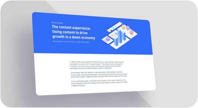 Exclusive guide The content experience: Using content to drive growth in a down economy How to get your content tech stack to deliver ROI in 2023. In 2023, brands must deal with the aftermath of an unprecedented couple of years and adapt to a seismic shift in buyer behavior. The pandemic turbo-charged the transition to an online-only economy, with physical opportunities becoming a secondary concern for brands looking to beat the competition. The economy finds itself poised in a delicate position, with potential customers hamstrung by reduced spending power and brands faced with driving both growth and results with a tighter budget (all while fending off other brands trying to do the same). In this unmissable guide, we dig deep into the power of the content experience and why it demands to lead the strategy of any brand looking to make a significant impact in 2023 and beyond.