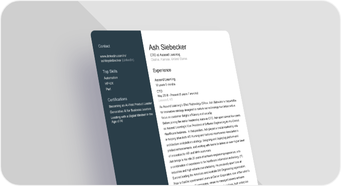 Contact Ash Siebecker www.linkedin.com/in/ CTO at Ascend Learning ashleysiebecker (LinkedIn) Olathe, Kansas, United States Top Skills Experience Automation Ascend Learning HP-UX 10 years 5 months Perl CTO May 2018 - Present (6 years 7 months) Certifications Leawood, KS Becoming an AI-First Product Leader As Ascend Learning’s Chief Technology Officer, Ash Siebecker is responsible Generative AI for Business Leaders for innovative strategy designed to mature our technology foundation with a Leading with a Digital Mindset in the Age of AI focus on customer delight, efficiency and security. Before joining the senior leadership team as CTO, Ash spent almost four years as Ascend Learning’s Vice President of Software Engineering for the Clinical Healthcare business. In that position, Ash played a crucial leadership role in helping drive both ATI Nursing and National Healthcareer Association’s architecture and platform strategy, designing and deploying platform and product enhancements, and working with teams to deliver an ever-higher level of innovation for ATI and NHA customers. Ash brings to his role 20 years of software engineering experience, with a combination of experience in the healthcare information technology (IT) industries and high-volume manufacturing. He previously spent time at Euronet leading the Americas and Australia SW Engineering organization. Prior to that he spent several years at Cerner Corporation, one of the nation’s leading healthcare IT companies, where he managed several software engineering organizations delivering a variety of solutions, both enterprise and client-facing. Ash also spent nearly seven years at Motorola/Freescale semiconductor. During much of his time there, he led the computer integrated manufacturing department at one of Motorola’s premier semiconductor fabrication facilities. Vice President Of Software Engineering July 2014 - Present (10 years 5 months) Leawood, KS • Responsible for Design, Development, and Support of all products for 2 SaaS platforms generating over $160M in revenue and used by 1M+ end-users. (www.atitesting.com, www.nhanow.com) Page 1 of 4
