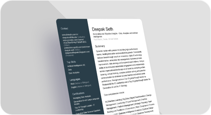 Contact Deepak Seth www.linkedin.com/in/ Actionable and Objective Insights - Data, Analytics and Artificial deepaksethitleader (LinkedIn) Intelligence www.youtube.com/channel/ Fort Worth, Texas, United States UCpDByurB-AqpTlz8a0FafEQ (Other) podcasters.spotify.com/pod/show/ Summary deepak-seth (Other) deepaksethspeak.blogspot.com/ Dynamic leader with passion for building high performance (Personal) teams, leading innovation and accelerating growth. Consistently delivers breakthrough results in innovation, digital & technology Top Skills transformation, enterprise risk management, business process Artificial Intelligence (AI) improvement, data strategy and program/project delivery. Unique Data ability to build trusted stakeholder engagement and relationships Data Analytics across organizational landscape at all levels by combining active listening, critical thinking, complex problem solving and powerful Languages communication to eliminate success barriers and achieve peak Hindi (Native or Bilingual) performance. Recognized as a Top 10 global thought leader by English (Native or Bilingual) Thinkers360 for IT Leadership and a Top 25 global thought leader for Generative AI and for IT Strategy. Certifications Managing Data Analysis Core competencies include: Generative AI with Large Language Models AI | Machine Learning | Big Data | Digital Transformation | Change Top 10 Thought Leader - IT Management | Leadership |Project Management | Portfolio Leadership Executive Data Science Capstone Management | Platform Management | Strategic Planning | Team Building and Facilitation | Governance | Risk | Compliance | Process Publications Improvement | Business Intelligence | Analytics | Systems Design DEEPakAI: AI Demystified and Integration | Solutions Architecture | Business Development| Presentations | Training | Mentoring. Experience Gartner Director Analyst/Expert - Data, Analytics and Artificial Intelligence May 2024 - Present (7 months) Dallas-Fort Worth Metroplex Texas Christian University - M.J. Neeley School of Business Adjunct Professor January 2024 - Present (11 months) Page 1 of 7