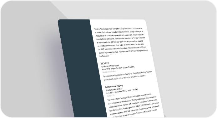 funding. Worked with HHS during the initial phases of the COVID pandemic to enable doctors to use broadband for telemedicine. Brought industry to the White House to participate in roundtables to expand U.S. network equipment manufacturing and exports. Participated in Committee on Foreign Investment in the United States (CFIUS) and Team Telecom pro-ceedings. Assisted on communications supply chain policy development and execution. Led the R&D, laboratory, and standards portions of the Administration's 5G and Beyond Implementation Plan. Reports to the US CTO and Deputy Assistant to the President. atfCYBER Chairman Of The Board March 2017 - September 2019 (2 years 7 months) Greater Seattle Area Cybersecurity authentication solutions for IoT. Raised seed funding. Founders ran into health issues and we decided to wind down the company. Public Interest Registry Non Executive Director June 2015 - September 2017 (2 years 4 months) Reston, VA The Public Interest Registry (PIR) is a multinational corporation in the communications services business. Developed strategy to grow revenues in a stagnating market. Involved with strategy and negotiations to reduce cost of operations by 50%. Revenue grew from $60MM to $100MM with a most recent enterprise valuation at $1.14B. International, diverse board. Chair of Finance & Audit Committee; served as Corporate Treasurer and Corporate Secretary. StandardsTrack Independent Consultant and Expert Witness June 2008 - September 2017 (9 years 4 months) Consulting to the Internet, Web, telecommunications, legal, and financial services industry on technology issues, product plans, new product introduction, and corporate change. On hold while I am at the FCC. Dexrex LLC Advisory Board January 2008 - January 2017 (9 years 1 month) Page 5 of 9