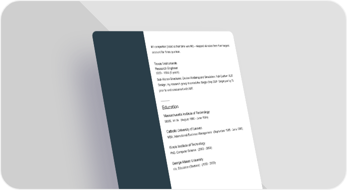 #1 competitor (Valid at that time was #2) – stopped all sales from their largest account for three quarters. Texas Instruments Research Engineer 1979 - 1984 (5 years) Sub-Micron Structures; Device Modeling and Simulation; Full-Custom VLSI Design; my research group invented the Single-Chip DSP. Employed by TI prior to and concurrent with MIT. Education Massachusetts Institute of Technology SBEE, VI-1A · (August 1980 - June 1984) Catholic University of Leuven MBA, International Business Management · (September 1988 - June 1990) Illinois Institute of Technology PhD, Computer Science · (2003 - 2006) George Mason University n/a, Education (Doctoral) · (1999 - 2003) Page 9 of 9