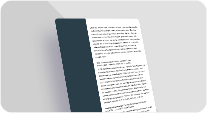 Effective IT is critical to the achievement of overall government objectives. As the Corporate Chief Strategist, Samantha lead the alignment of IT strategy, policy and governance with government priorities and directions. Samantha directed transformative, IT-enabled change to government business, while simultaneously generating cost-savings and efficiencies and driving innovative solutions. She set the strategic directions in the federated I&IT organization within the Ontario government, supported implementation and control, provided advice to Management Board of Cabinet and Treasury Board, managed the enterprise architecture and reference models and prepared the annual IT report. Chief Information Officer, Central Agencies Cluster November 2008 - September 2010 (1 year 11 months) As CIO, Samantha provided information and information technology leadership to the ministries of Finance, Revenue, Energy & Infrastructure and Cabinet Office managing an annual budget of $87M and 290 staff. During her tenure, Samantha delivered key initiatives including the Ontario news room (the Ontario government’s online news distribution portal), the infrastructure stimulus tracking portal (open data and analytical visualizations on the $33B infrastructure spend), Ontario taxes online (a $135M, 6 year major IT project) and launched one of the first public sector telework pilots. Samantha also oversaw significant increases in employee engagement and client satisfaction, with employee engagement up to 74% from 66% and Internal Business Client Satisfaction survey results of: 2008=49%, 2009=58%, 2010=78%. Head (Director) Strategy & Planning, Central Agencies Cluster August 2007 - October 2008 (1 year 3 months) Samantha provided leadership in strategic planning, communications, project and information management, IT security, privacy and architecture. She managed a branch of 45 staff and an annual budget of $10M and spear- headed converting consulting resources to FTE to be used as an internal bench of flexible resources to allow balance of supply with demand. Head (Director) Customer Services and PMO, Infrastructure Technology Services September 2005 - July 2007 (1 year 11 months) Director responsible for customer services branch and project management office. Engaged with ministry clients across 27 government ministries and 8 I&IT clusters on 'keeping the lights on' and project activities. Annual project expenditures in excess of $25m. Direct responsibility for 60 staff. Page 3 of 4