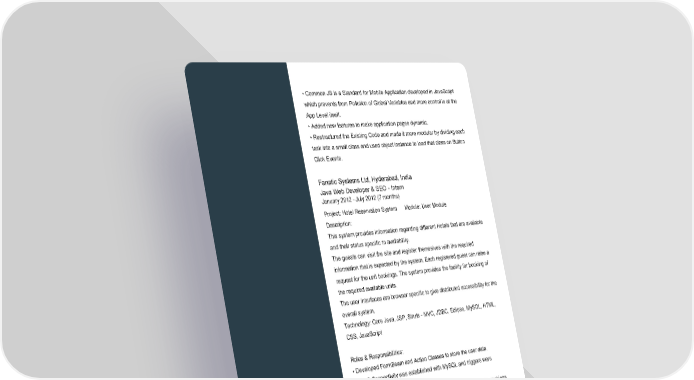 • Common JS is a Standard for Mobile Application developed in JavaScript which prevents from Pollution of Global Variables and more control is at the App Level itself. • Added new features to make application pages dynamic. • Restructured the Existing Code and made it more modular by dividing each task into a small class and used object instance to load that class on Button Click Events. Fanatic Systems Ltd, Hyderabad, India Java Web Developer & SEO - Intern January 2012 - July 2012 (7 months) Project: Hotel Reservation System Module: User Module Description: This system provides information regarding different Hotels that are available and their status specific to availability. The guests can visit the site and register themselves with the required information that is expected by the system. Each registered guest can raise a request for the unit bookings. The system provides the facility for booking of the required available units. The user interfaces are browser specific to give distributed accessibility for the overall system. Technology: Core Java, JSP, Struts - MVC, JDBC, Eclipse, MySQL, HTML, CSS, JavaScript Roles & Responsibilities: • Developed FormBeam and Action Classes to store the user data. • JDBC Connectivity was established with MySQL and triggers were implemented for log pupose. • Used SEO best practice to optimize Web site for search engine rankings. MeritTrac Service's Pvt Ltd. Team Lead Manager April 2008 - June 2012 (4 years 3 months) Secunderābād, Telangana, India • Coordinated Interviews with Line Managers • Data Expert - Responsible for Ensuring data entry quality, end of day summary for Clients to influence future Hiring Events. • Led a team and conducted assessment process at on campus, off campus, placement agencies and for advertisement walk-in • Conducted interviews for freelance position at MeritTrac Services Pvt Ltd Page 12 of 13