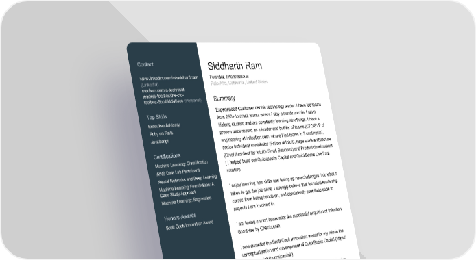 Contact Siddharth Ram www.linkedin.com/in/siddharthram Founder, Intermezzo.ai (LinkedIn) Palo Alto, California, United States medium.com/a-technical- leaders-toolbox/the-cto- toolbox-6bc494d484cc (Personal) Summary Experienced Customer centric technology leader. I have led teams Top Skills from 250+ to small teams where i play a hands on role. I am a Executive Advisory lifelong student and am constantly learning new things. I have a Ruby on Rails proven track record as a leader and builder of teams (CTO/SVP of JavaScript engineering at Inflection.com, where I led teams in 3 continents), senior individual contributor (Fellow at Intuit), large scale architecture Certifications (Chief Architect for Intuit's Small Business) and Product development Machine Learning: Classification ( I helped build out QuickBooks Capital and QuickBooks Live from AWS Data Lab Participant scratch) Neural Networks and Deep Learning Machine Learning Foundations: A I enjoy learning new skills and taking up new challenges. I do what it Case Study Approach takes to get the job done. I strongly believe that technical leadership Machine Learning: Regression comes from being hands on, and consistently contribute code to projects I am involved in. Honors-Awards Scott Cook Innovation Award I am taking a short break after the successful acquition of Inflection/ GoodHire by Checkr.com. I was awarded the Scott Cook Innovation award for my role in the conceptualization and development of QuickBooks Capital (https:// quickbooks.intuit.com/capital/) Software is a team sport, and I thrive in building and unblocking teams. I have built out global teams in India, Brazil and Ukraine. Experience Intermezzo.ai Founder July 2024 - Present (5 months) DNX Ventures Advisory Board Member January 2023 - Present (1 year 11 months) Page 1 of 4