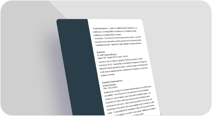* Product Development - Leader for multiple products: QuickBooks Live (marketplace connecting SMB's to Bookkeepers), QuickBooks Capital (marketplace connecting SMB's to lenders) * Architecture - Chief Architect of Intuit's Small Business Division, with 2000 engineers covering accounting, payroll, payments and a developer platform * Individual contributor - helped push Intuit's Machine Learning capabilities Qualcomm Sr. Staff Engineer/Manager August 1993 - August 2005 (12 years 1 month) I worked on various projects ranging from IS-95 (first generation CDMA networks) to EV-DO. I have worked on the Network Management Software as well as the network side protocol stacks. I was the manager and technical lead for the network management team, consisting of 30+ engineers, as well as an individual contributor. Ensemble Communications Software Manager 1999 - 2003 (4 years) Ensemble was a startup in the wireless broadband space in the LMDS space (pre-WiMax). I filled various roles in the organization.The first challenge handed to me was to design a best in class failure protection system - one accepted to US Telcos, which require recovery within 50 milliseconds to prevent service interruption. I had primary responsibility for the design and development of this system, which was completed within 9 months and under budget. I subsequently led the development of the CPE (Customer Premise Equipment) and ramped it up so that it could support 100Mbps over wireless. I worked at Ensemble till about 3 months before it closed. LCC Inc Software Engineer August 1990 - August 1993 (3 years 1 month) Developed Unix based graphical software to visualize various propagation models. The models were used to determine proper placement of cell towers for coverage of AMPS (first generation analog mobile network) Education State University of New York, Stony Brook Page 3 of 4