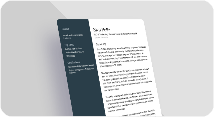 Contact Siva Pothi www.linkedin.com/in/pothi CIO & Technology Services Leader @ Teleperformance SE (LinkedIn) Greater Houston Top Skills Summary Building New Business Siva Pothi is a technology executive with over 25 years of leadership Artificial Intelligence (AI) experience in the high-tech industry. As CIO at Teleperformance IT Strategy (TP), he leverages technology to empower TP employees to do their best work every day. In addition to his CIO role, Siva oversees Certifications Global Technology Services' commercial offerings, delivering value- Generative AI for Business Leaders driven solutions to TP clients. Project Management Professional (PMP)® Siva has worked for some of the world’s most renowned companies over the years, delivering and supporting mission-critical systems that power global business operations. Collaborating closely with CEOs and Boards, he helps assess the strategic impact of technology and shape innovative business models that drive growth and transformation. Known for building high-performing global teams, Siva fosters a culture of continuous learning, collaboration, and customer focus. He is passionate about leveraging emerging technologies, such as big data and AI, to optimize enterprise performance and elevate customer experiences. An engineer at heart with a strategic growth mindset. Siva holds an engineering degree and certifications in project management, cloud computing, and corporate finance, offering a well-rounded perspective on technology and business. Experience Teleperformance 2 years 11 months CIO & Global Technology Services Offering Leader February 2024 - Present (10 months) As CIO for USA, Canada, and Senture (Government Services), I lead IT strategy and operations, fostering innovation and driving efficiency across Page 1 of 4