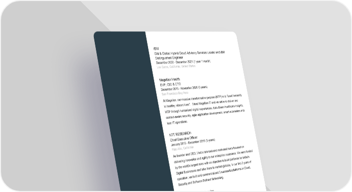 IBM GM & Global Hybrid Cloud Advisory Services Leader and IBM Distinguished Engineer December 2020 - December 2021 (1 year 1 month) Los Gatos, California, United States Magellan Health EVP, CIO & CTO December 2015 - November 2020 (5 years) San Francisco Bay Area At Magellan, our massive transformative purpose (MTP) is to "Lead humanity to healthy, vibrant lives". I lead Magellan IT and we strive to deliver our MTP through humanized digital experiences, data driven healthcare insights, context-aware security, agile application development, smart automation and lean IT operations. NTT RESEARCH Chief Executive Officer January 2013 - December 2015 (3 years) Palo Alto, California As founder and CEO, I led a talented and motivated team focused on delivering innovation and agility to our enterprise customers. We were funded by the world's largest telco with an objective to build platforms for today's Digital Businesses and take them to market globally. In our first 2 years of operation, we built and commercialized 3 successful platforms in Cloud, Security and Software Defined Networking. Hewlett Packard Enterprise SVP and GM - Strategic Enterprise Services January 2011 - December 2012 (2 years) Palo Alto As GM and Chief Development Officer I led a global team that delivered revenue growth of 35% over 2 years and a gross margin of 16% by developing and implementing global consulting practices and offerings for Strategic Enterprise Services focusing on Business Analytics, Cloud Computing, and Mobile Computing. Nationwide SVP, CIO and CTO January 2002 - January 2011 (9 years 1 month) Columbus, Ohio Area Page 3 of 4