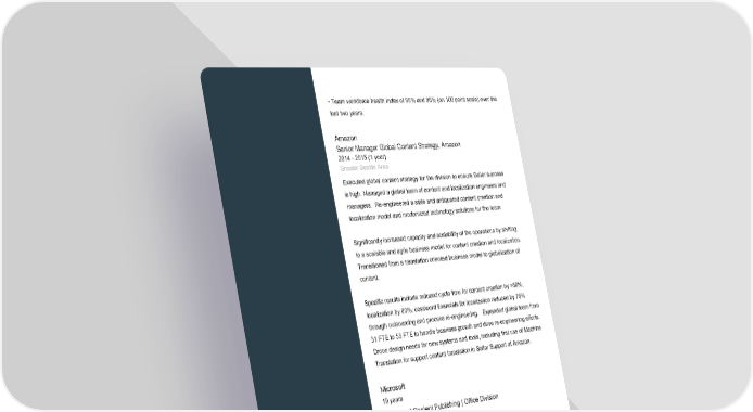 • Team workforce health index of 95% and 96% (on 100 point scale) over the last two years. Amazon Senior Manager Global Content Strategy, Amazon 2014 - 2015 (1 year) Greater Seattle Area Executed global content strategy for the division to ensure Seller success is high. Managed a global team of content and localization engineers and managers. Re-engineered a stale and antiquated content creation and localization model and modernized technology solutions for the team. Significantly increased capacity and scalability of the operations by shifting to a scalable and agile business model for content creation and localization. Transitioned from a translation oriented business model to globalization of content. Specific results include reduced cycle time for content creation by >50%; localization by 80%; cost/word financials for localization reduced by 76% through outsourcing and process re-engineering. Expanded global team from 31 FTE to 55 FTE to handle business growth and drive re-engineering efforts. Drove design needs for new systems and tools, including first use of Machine Translation for support content translation in Seller Support at Amazon. Microsoft 19 years Director of Content Publishing | Office Division 2012 - 2014 (2 years) Redmond Led technical teams responsible for user assistance and technical knowledge in planning, deployment, and operations for Enterprise and Business users in Office 365, Exchange, Skype, and SharePoint. Owned design and development of technology solutions to create and manage user assistance information for Office Division. Define content strategies focusing on Enterprise to medium size business users. Accountable for user assistance related to planning, deployment and operations for Office 365, Exchange, Lync, SharePoint. Page 4 of 8