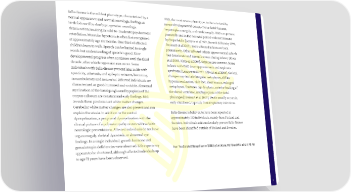Salla disease is the mildest phenotype, characterized by a ISSD, the most severe phenotype, is characterized by normal appearance and normal neurologic findings at severe developmental delays, coarse facial features, birth followed by slowly progressive neurologic hepatosplenomegaly, and cardiomegaly. ISSD can present deterioration resulting in mild-to- moderate psychomotor prenatally and in the neonatal period with nonimmune retardation. Muscular hypotonia is often first recognized hydrops fetalis [Lemyre et al 1999, Stone & Sidransky 1999, at approximately age six months. One third of affected Froissart et al 2005]. Some affected infants are born children learn to walk. Speech can be limited to single prematurely. Other affected infants appear normal at birth words but understanding of speech is good. Slow but deteriorate and lose milestones during infancy [Kleta developmental progress often continues until the third et al 2003, Kleta et al 2004]. Seizures are common. Some decade, after which regression can occur. Some infants with ISSD develop proteinuria and nephrotic individuals with Salla disease present later in life with syndrome [Lemyre et al 1999, Ishiwari et al 2004]. Skeletal spasticity, athetosis, and epileptic seizures, becoming changes may include irregular metaphyses, diffuse nonambulatory and nonverbal. Affected individuals are hypomineralization, club feet, short femurs, enlarged characterized as good-humored and sociable. Abnormal metaphyses, fractures, hip dysplasia, anterior beaking of myelination of the basal ganglia and hypoplasia of the the dorsal vertebrae, and hypoplasia of the distal corpus callosum are constant and early findings. MRI phalanges [Froissart et al 2005]. Death usually occurs in reveals these predominant white matter changes. early childhood, typically from respiratory infections. Cerebellar white matter changes are also present and can Salla disease is believed to have been reported in explain the ataxia. In addition to the central approximately 150 individuals, mainly from Finland and dysmyelination, a peripheral dysmyelination with the Sweden. Individuals with molecularly proven Salla disease clinical picture of a polyneuropathy occurs with variable have been identified outside of Finland and Sweden. neurologic presentations. Affected individuals do not have organomegaly, skeletal dysostosis, or abnormal eye findings. In a single individual, growth hormone and gonadotropin deficiencies were observed. Life expectancy Letter from STAR President From "Free Sialic Acid Storage Disorders" (2013) by David Adams, MD, PhD and William A Gahl, MD, PhD appears to be shortened, although affected individuals up to age 72 years have been observed. 9