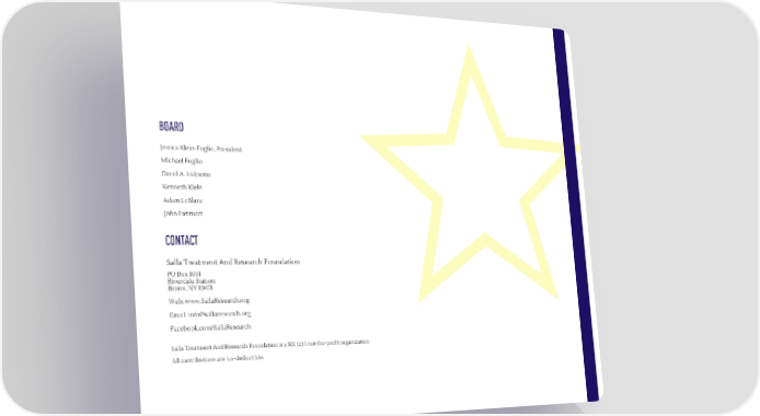 BOARD Jessica Klein-Foglio, President Michael Foglio David A. Halperin Kenneth Klein Adam LeBlanc John Patitucci CONTACT Salla Treatment And Research Foundation PO Box 1051 Riverdale Station Bronx, NY 10471 Web: www.SallaResearch.org Email: [email protected] Facebook.com/SallaResearch Salla Treatment And Research Foundation is a 501 (c) 3 not-for-profit organization. All contributions are tax-deductible.