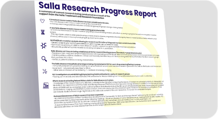 Salla Research Progress Report A summary of current research being conducted as a result of the support from the Salla Treatment and Research Foundation A knockout mouse model of Salla disease has been established at Einstein. -The CNS disease in this mouse model is being fully characterized. -A therapy examining substrate reduction directed at glycosphingolipid storage is being tested. A new Salla disease knockin mouse model is being generated at NIH. -A CRISPR SLC17A5 knock-in Finnish mutation (Arg39Cys) mouse is being created, with efforts currently in progress focused on a targeted mutation screen. -This new model, which is anticipated to show a more chronic disease progression than the rapidly fatal KO model (and thus better reflect human disease), will be used in future phenotyping/drug treatment studies. SLC17A5/Sialin mutation analysis allowing for research confirmation of diagnosis has been established at NIH. -Genetic screening for SLC17A5 gene defects on gDNA has been set up (research base). -Optimized sequencing of mRNA to show effects of specific mutations on gene expression has been established. -All currently published SLC17A5 mutations are being compiled for a publication. Salla disease cell lines are being established at NIH for research/sharing purpose (fibroblasts + lymphoblastoid cells). -Fibroblasts (skin cells) and Lymphoblastoid (blood) cells now being established will allow us to look at the disease state in a controllable cell model. -Coriell repository cell lines: Mutations in these commercially available SALLA cell lines are being determined, informative for other research groups that purchase these lines. -NIH SALLA patient cell lines are being characterized. The Salla disease intracellular phenotype is being characterized at NIH for use in drug screening/testing + purpose. -Immunofluorescent (IF) lysosomal staining on SALLA fibroblast cultures were started to establish lysosomal size, cellular distribution and intracellular movement - not previously described for SALLA. - Other cellular markers will be tested by IF + confocal microscopy imaging. NIH investigators are establishing/characterizing SIALIN antibodies for use by all research groups. -Testing commercially available Sialin/SLC17A5 antibodies for Western Blotting and immunofluorescence on human cells is underway. Efforts toward collecting Natural History data for Salla disease are in place. -Knowledge of the natural history of a disorder is valuable to the FDA when comparing the results of treated and untreated patients. Dr. Wasserstein at Montefiore has experience with Free Sialic Acid Storage Diseases (FSASDs) and other lysosomal storage diseases. In addition, a limited natural history study of FSASD can be conducted under a clinical protocol that already exists at the NIH. Up to 6 affected individuals would be evaluated with medical consultations, imaging, and SLC17A5 mutation analysis, and a skin biopsy would be obtained to grow fibroblasts for laboratory investigations. Those can include studies of what drugs might reduce the sialic acid content of the cells’ lysosomes, in a screen for candidate therapies. Outreach/awareness of SALLA research has been expanded. -An abstract and poster entitled “Collaborative Development of Therapeutics for Sialic Acid Storage Disease” authored by NIH and Einstein scientists will be presented by Mary Hackbarth at the following meetings. {American Society of Human Genetics annual meeting (Oct 15-19, 2019; Houston, TX); 2019 NHGRI Symposium (Nov 25-26, 2019, NIH Campus, Bethesda, MD); ASCB/EMBO annual meeting (Dec 7-11, 2019, Washington, DC). -A second Salla disease Think Tank meeting is being scheduled for September, 2020, to be held at the NIH. Like the first think tank, scientists and clinicians with focus on Salla disease from the US and Europe will be invited to attend.