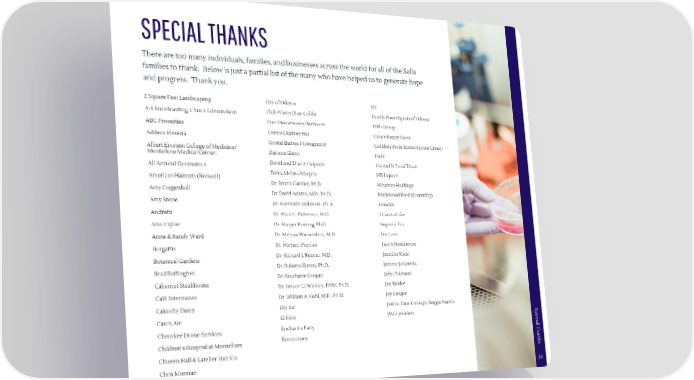SPECIAL THANKS There are too many individuals, families, and businesses across the world for all of the Salla families to thank. Below is just a partial list of the many who have helped us to generate hope and progress. Thank you. City of Odessa EY 2 Square Feet Landscaping Club Pilates (East Cobb) Family PowerSports of Odessa A-1 Broadcasting, Chuck Edmundson Cora Housewares Hardware Fifth Group ABC Prooerties Costco (Alpharetta) Gina’s Happy Faces Addeos Pizzeria Crystal Barbee Photography Goldfish Swim School (Johns Creek) Albert Einstein College of Medicine/ Darlene Glenn Hal’s Montefiore Medical Center. David and Shanit Halperin Hannah’s Food Truck All Around Gymnastics Delta, Melissa Murphy HB Liquors American Haircuts (Roswell) Dr. Bruno Gasnier, Ph.D. Hinzman Holdings Amy Coggeshall Dr. David Adams, M.D., Ph.D. Hollywood Feed (Cumming) Amy Stone Dr. Kostantin Dobrenis, Ph.D. Houcks Andretti Dr. Marc C. Patterson, M.D. I Canita Cake Ann Taylor Dr. Marjan Huizing, Ph.D. Imperial Fez Dr. Melissa Wasserstein, M.D. Ivy Lane Anne & Randy Ward Dr. Michael Papciak Jake's Steakhouse Borgattis Dr. Richard J. Reimer, M.D. Jennifer Klein Botanical Gardens Dr. Roberto Zoncu, Ph.D. Jeremy Jutkowitz Brad Buffington Dr. Stephanie Grogan John Patitucci Cabernet Steakhouse Dr. Steven U. Walkley, DVM, Ph.D. Joy Beider Café Intermezzo Dr. William A. Gahl, M.D., Ph.D. Joy Langer Cakes by Darcy Dry Bar Just in Time Consign, Reggie Martin Special Thanks El Felix JWO Jewelers Catch Air Enchant a Party Cherokee Drone Services Ennerations Children’s Hospital at Montefiore Chireen Hall & Latelier Hair Co. Chris Morman 20