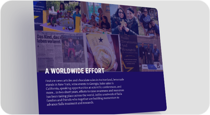 A WORLDWIDE EFFORT Feature news articles and chocalate sales in Switzerland, lemonade stands in New York, wine events in Georgia, bake sales in California, speaking opportunities at scientific conferences, and more... in two short years, efforts to raise awareness and resources has been taking place across the world, led by a network of Salla families and friends who together are building momentum to advance Salla treatment and research.