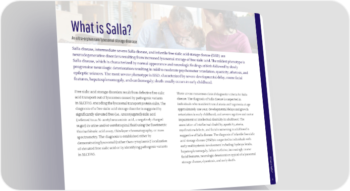 What is Salla? An ultra-orphan rare lysosomal storage diserase Salla disease, intermediate severe Salla disease, and infantile free sialic acid storage disease (ISSD) are neurodegenerative disorders resulting from increased lysosomal storage of free sialic acid. The mildest phenotype is Salla disease, which is characterized by normal appearance and neurologic findings at birth followed by slowly progressive neurologic deterioration resulting in mild to moderate psychomotor retardation, spasticity, athetosis, and epileptic seizures. The most severe phenotype is ISSD, characterized by severe developmental delay, coarse facial features, hepatosplenomegaly, and cardiomegaly; death usually occurs in early childhood. Free sialic acid storage disorders result from defective free sialic There are no consensus clinical diagnostic criteria for Salla acid transport out of lysosomes caused by pathogenic variants disease. The diagnosis of Salla disease is suspected in in SLC17A5, encoding the lysosomal transport protein sialin. The individuals who manifest truncal ataxia and hypotonia at age diagnosis of a free sialic acid storage disorder is suggested by approximately one year, developmental delays and growth significantly elevated free (i.e., unconjugated) sialic acid retardation in early childhood, and severe cognitive and motor (referred to as N- acetylneuraminic acid, a negatively charged impairment or intellectual disability in adulthood. The sugar) in urine and/or cerebrospinal fluid using the fluorimetric association of intellectual disability, spasticity, ataxia, thiobarbituric acid assay, thin-layer chromatography, or mass myelination defects, and facial coarsening in adulthood is spectrometry. The diagnosis is established either by suggestive of Salla disease. The diagnosis of infantile free sialic demonstrating lysosomal (rather than cytoplasmic) localization acid storage disease (ISSD) is suspected in individuals with of elevated free sialic acid or by identifying pathogenic variants early multisystemic involvement including: hydrops fetalis, in SLC17A5. hepatosplenomegaly, failure to thrive, increasingly coarse facial features, neurologic deterioration typical of a lysosomal What is Salla? storage disease, dysostosis, and early death. 8