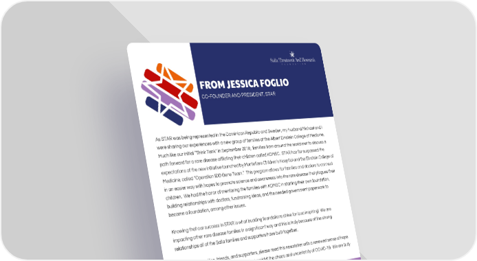 FROM JESSICA FOGLIO CO-FOUNDER AND PRESIDENT, STAR As STAR was being represented in the Dominican Republic and Sweden, my husband Michael and I were sharing our experiences with a new group of families at the Albert Einstein College of Medicine. Much like our initial “Think Tank” in September 2018, families from around the world met to discuss a path forward for a rare disease afflicting their children called KDM5C. STAR has far surpassed the expectations of the new initiative launched by Montefiore Children’s Hospital and the Einstein College of Medicine, called “Operation IDD Gene Team.” This program allows for families and doctors to connect in an easier way with hopes to promote science and awareness into the rare disease that plagues their children. We had the honor of mentoring the families with KDM5C in starting their own foundation, building relationships with doctors, fundraising ideas, and the needed government paperwork to become a foundation, among other issues. Knowing that our success in STAR is what budding foundations strive for is so inspiring! We are impacting other rare disease families in a significant way and this is truly because of the strong relationships all of the Salla families and supporters have built together. To our Salla families, friends, and supporters, please read this newsletter with a renewed sense of hope. Rest assured that we will remain steadfast amidst the chaos and uncertainty of COVID-19. We are truly pioneering the outcome and science of this disease. With warmest regards and deepest thanks, “It’s quite a scary path to walk on, when you have no one’s past Jessica experience to lean on, or learn from. It’s all new and uncharted... but nothing is finished unless it is started.” 10