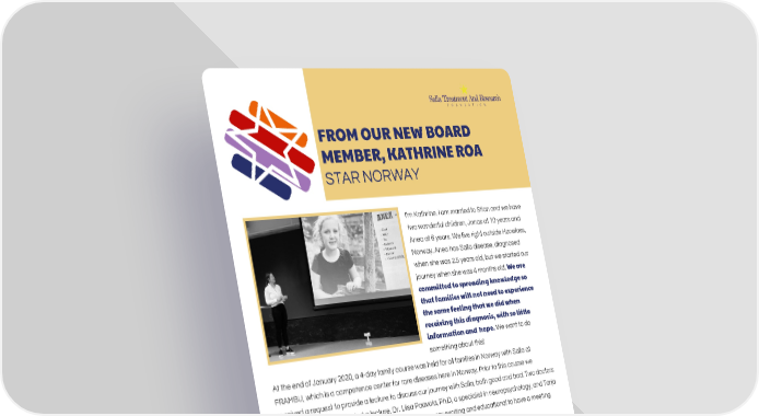 FROM OUR NEW BOARD MEMBER, KATHRINE ROA STAR NORWAY I'm Kathrine. I am married to Stian and we have two wonderful children, Jonas at 10 years and Anea at 6 years. We live right outside Hønefoss, Norway. Anea has Salla disease, diagnosed when she was 2.5 years old, but we started our journey when she was 4 months old. We are committed to spreading knowledge so that families will not need to experience the same feeling that we did when receiving this diagnosis, with so little information and hope. We want to do something about this! At the end of January 2020, a 4-day family course was held for all families in Norway with Salla at FRAMBU, which is a competence center for rare diseases here in Norway. Prior to this course we received a request to provide a lecture to discuss our journey with Salla, both good and bad. Two doctors from Finland also conducted a lecture, Dr. Liisa Paavola, Ph.D, a specialist in neuropsychology, and Tarja Varho, MD, a specialist in pediatric neurology. It was very exciting and educational to have a meeting with them and to create more useful and stronger contacts for the future. Stian and I have now started a separate organization in Norway, STAR Norway (Salla Treatment And Research Foundation). This is exciting! One separate chapter in Norway with the support of STAR and Jessica. The road continues to grow as we move forward and we learn something new each day. We seek to build a network for families around the world, advancing awareness and knowledge about the disease. With the huge support we are already receiving, I am confident that together, we can do this! Kathrine 7