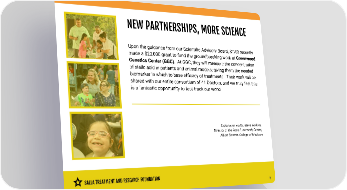 NEW PARTNERSHIPS, MORE SCIENCE Upon the guidance from our Scientific Advisory Board, STAR recently made a $20,000 grant to fund the groundbreaking work at Greenwood Genetics Center (GGC). At GGC, they will measure the concentration of sialic acid in patients and animal models; giving them the needed biomarker in which to base efficacy of treatments. Their work will be shared with our entire consortium of 41 Doctors, and we truly feel this is a fantastic opportunity to fast-track our work! Explanation via Dr. Steve Walkley, Director of the Rose F. Kennedy Center, Albert Einstein College of Medicine SALLA TREATMENT AND RESEARCH FOUNDATION 6