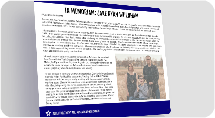 IN MEMORIAM: JAKE RYAN WHENHAM BY ALEASHA WHENHAM Our son Jake Ryan Whenham, who had Salla disease, died on November 8, 2021, when he was 15 years old. We would be honoured by any donations made to the STAR Foundation in Jake’s memory. After months of pain and 3 years of a slow decline in ability, Jake died peacefully at his home in Alexander, MB Canada on November 8, 2021. He was surrounded by family and love the last 2 days of his life. He lived the best life his body and mind would allow. Jake was born in Thompson, MB Canada on January 13, 2006. He moved with his family to Mitchell, MB in 2008 and then to Alexander, MB in November 2020. In his younger years there wasn’t a Tim Horton’s or pay phone that escaped his attention. His nicknames included Little Man; Butt Munch; Rooster; Mr. Jake; Jake-Jaker and ‘Just Jake’. He had a fear of missing out (FOMO) and we often told him how nosey he was. He loved to dress up in a suit. He loved the ladies and liked guy time. He loved meeting people, shaking hands and saying hi. Often, he would take the hand of 2 different people and put them together. He craved connection. We often joked that Jake was the mayor of Mitchell. He enjoyed a good party but was very clear when it was time to leave (would wave/say good-bye or get his hat). Whenever a new girlfriend or boyfriend came into the family, there was an unwritten test called the “Jake test”. If Jake approved, they were in. He was perceptive. Jake was the guy at church who noticed the nervous newcomers. He would walk to them, sit down beside them and quietly hold their hand. His work included volunteering at the compost bin in Steinbach, the annual Fall Food Drive with the Youth Group and The Manitoba Riding For Disability Flea Market, Bud Spud and Steak Night and Physiofit run. Although he didn’t have a job outside the house, he helped his dad mow the lawn and helped with household chores (especially when his aunty Roxanne was around). He was involved in Move and Groove, Steinbach United Church, Challenger Baseball, Manitoba Riding For Disability Association, Cooking Club and Music Therapy. His interests included people; family; wrestling with his parents; game shows; watching sports (despite his parents not being as interested); truck rides; side by side rides; being a wing man for his cousin; looking for deer; swimming; school; family games and eating (especially cookies, donuts and smoothies). Jake was a good sport. His parents dragged him on all sorts of adventures. These included skating on a sleigh; meeting the Governor General twice; camping; Jets games and baseball/soccer games. He travelled to British Columbia; Saskatchewan; Alberta; Ontario; North Dakota, the Ice Castles in Winnipeg, Corn Mazes and went on a Disney Cruise. SALLA TREATMENT AND RESEARCH FOUNDATION 11