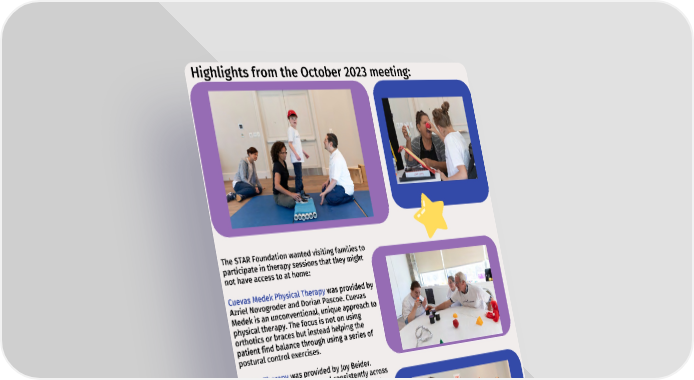 Highlights from the October 2023 meeting: The STAR Foundation wanted visiting families to participate in therapy sessions that they might not have access to at home: Cuevas Medek Physical Therapy was provided by Azriel Novogroder and Dorian Pascoe. Cuevas Medek is an unconventional, unique approach to physical therapy. The focus is not on using orthotics or braces but instead helping the patient find balance through using a series of postural control exercises. Vision Therapy was provided by Joy Beider. Vision therapy is not offered consistently across the U.S. Through use of color/strong contrast, this therapy is used to help Salla patients process what they are seeing. Occupational Therapy was provided by Kouli Nalpantidis. While, occupational therapy is a standard therapy offered to Salla patients, what makes Kouli exceptional is her knowledge of massage techniques to help alleviate tight, fisted hands. These wonderful photos were taken by our photographer, Daniel Shapiro. https://www.shapiroeventphoto.nyc/ NOVEMBER 2023 PG 3