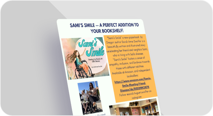 SAMI’S SMILE -- A PERFECT ADDITION TO YOUR BOOKSHELF! “Sami’s Smile” a new paperback by Oregon author Sarah Anne Swoffer is a beautifully written and illustrated story celebrating her friend and neighbor Sami, who is living with Salla disease. "Sami's Smile" fosters a sense of empathy, inclusion, and kindness towards those with different abilities. Available at Amazon, and independent booksellers: https://www.amazon.com/Samis- Smile-Meeting-Friend- Disease/dp/B0D2HWCM7H Follow @sarah.huguet.swoffer on instagram Sami blows kisses to the crowd during a reading. Sarah Ann and Sami hosting a book reading at a local school and answering audience questions. page 4 of 8 www.sallaresearch.org