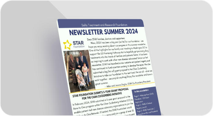 Salla Treatment and Research Foundation NEWSLETTER SUMMER 2024 Dear STAR families, doctors and supporters: Wow, 2024 has been a big year (so far) for our foundation – we hope you enjoy reading about our progress in this summer newsletter. One of the highlights for our family was traveling to Washington DC to support the US Promising Pathways Act to hopefully get promising drug treatments into the hands of families and patients faster. It has been so inspiring to work with other rare disease advocates! Since our last newsletter, STAR has launched a new website and patient registry and has continued to fund scientists working to develop therapies. We also submitted a big (for us!) grant proposal to the Chan Zuckerberg Initiative to take our foundation to the next level. We can all – when we work together – accomplish anything! Enjoy this newsletter and have a great summer. -- Mike and Jessica Foglio, STAR Co-Founders/President STAR FOUNDATION SUBMITS 5-YEAR GRANT PROPOSAL FOR THE CHAN ZUCKERBERG INITIATIVE In this newsletter: In February 2024, STAR submitted a 5-year grant proposal to the Page 1 - Welcome from STAR's Rare As One program within the Chan Zuckerberg Initiative (CZI) to President / CZI Grant Application enable patient-led rare disease advocacy organizations to join the Page 2 - RARE-X Patient CZI Rare As One Network. If funded, the STAR Foundation would Registry Launch receive up to $800,000 over five years and join a group of over 50 Page 3 - RARE Fundraiser / rare disease organizations around the world, each working toward Using Donor Box and Facebook the goals of their own foundation while building a network and to Raise Funds Page 4 - “Sami's Smile: Meeting learning from each other. STAR's Scientific Advisory Board, Board of Our Friend with Salla Disease” Directors, families and stakeholders all provided input on the grant Page 5 - FSASD Consortium proposal, which included requested funding for part-time positions News and Publications at the Foundation, two in-person meetings between scientists and Page 6 - Newly Funded Grant / families, translation services for increased global outreach, and New Researcher in the Spotlight support in building an MRI imaging registry, among other things. Page 7 Summer Travel Tips and Resources We'll find out in August if we're a winner - it's a really competitive Page 8 - Contact / New process, but we think we've put together a great application! More Website Information information: https://chanzuckerberg.com/rfa/rare-as-one/ www.sallaresearch.org Page 1 of 8