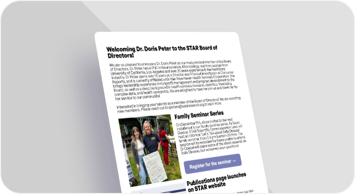 W e l c o m i n g D r . D o r i s P e t e r t o t h e S T A R B o a r d o f D i r e c t o r s ! W e a r e s o p l e a s e d t o a n n o u n c e D r . D o r i s P e t e r a s o u r n e w l y e l e c t e d m e m b e r o f t h e B o a r d o f D i r e c t o r s . D r . P e t e r h a s a P h D i n N e u r o s c i e n c e , M i c r o b i o l o g y , a n d I m m u n o l o g y f r o m U n i v e r s i t y o f C a l i f o r n i a , L o s A n g e l e s a n d o v e r 2 0 y e a r s e x p e r i e n c e i n t h e h e a l t h c a r e i n d u s t r y . D r P e t e r s p e n t o v e r 1 5 y e a r s a s a D i r e c t o r a n d P r i n c i p a l I n v e s t i g a t o r a t C o n s u m e r R e p o r t s , a n d i s c u r r e n t l y a f f i l i a t e d w i t h Y a l e - N e w H a v e n H e a l t h S e r v i c e s C o r p o r a t i o n . S h e b r i n g s l e a d e r s h i p e x p e r i e n c e i n n o n p r o f i t m a n a g e m e n t a n d p r o g r a m d e v e l o p m e n t t o t h e B o a r d , a s w e l l a s a d e e p b a c k g r o u n d i n h e a l t h s e r v i c e s r e s e a r c h , s t a t i s t i c s , t r a n s l a t i n g c o m p l e x d a t a , a n d h e a l t h c a r e p o l i c y . W e a r e d e l i g h t e d t o h a v e h e r j o i n u s a n d t h a n k h e r f o r h e r s e r v i c e t o o u r c o m m u n i t y ! I n t e r e s t e d i n b r i n g i n g y o u r t a l e n t s a s a m e m b e r o f t h e B o a r d o f D i r e c t o r s ? W e a r e r e c r u i t i n g n e w m e m b e r s . P l e a s e r e a c h o u t t o a j e n s e n @ s a l l a r e s e a r c h . o r g t o l e a r n m o r e . O n D e c e m b e r 1 1 t h , a l l a r e i n v i t e d t o t h e n e x t i n s t a l l m e n t i n o u r f a m i l y s e m i n a r s e r i e s . D r S a r a h G o e b e l , S T A R S c i e n t i f i c C o m m u n i c a t i o n L e a d , w i l l h o s t a n i n f o r m a l " L e t ' s T a l k a b o u t S a l l a D i s e a s e " f a m i l y s e m i n a r , f r o m 2 - 3 p m E a s t e r n U S t i m e . T h e s e s s i o n w i l l b e r e c o r d e d f o r t h o s e u n a b l e t o a t t e n d . D r G o e b e l w i l l s h a r e s o m e o f t h e l a t e s t r e s e a r c h o n S a l l a D i s e a s e , b u t w e l c o m e s y o u r q u e s t i o n s ! F a m i l y S e m i n a r S e r i e s T h e S T A R F o u n d a t i o n i s p l e a s e d t o s h a r e o u r n e w p u b l i c a t i o n s p a g e , a n a c c e s s i b l e a n d i n f o r m a t i v e r e s o u r c e f e a t u r i n g p u b l i c a t i o n s a b o u t F r e e S i a l i c A c i d S t o r a g e D i s o r d e r s ( F S A S D ) a n d S a l l a d i s e a s e . E a c h p u b l i c a t i o n i n c l u d e s a " k e y f i n d i n g " p l u s a l i n k t o t h e a r t i c l e t o l e a r n m o r e , d e s i g n e d t o s h a r e k n o w l e d g e w i t h a n y o n e i n t e r e s t e d . F a m i l y m e m b e r s c a n s h a r e w i t h h e a l t h c a r e p r o v i d e r s , s c h o o l s t a f f , f a m i l y , o r f r i e n d s . W e d e e p l y a p p r e c i a t e t h e o n g o i n g p r o g r e s s m a d e b y t h e s c i e n t i f i c c o m m u n i t y ! I f y o u h a v e a p u b l i c a t i o n t o a d d , p l e a s e c o n t a c t s a r a h g @ s a l l a r e s e a r c h . o r g . P u b l i c a t i o n s p a g e l a u n c h e s o n S T A R w e b s i t e