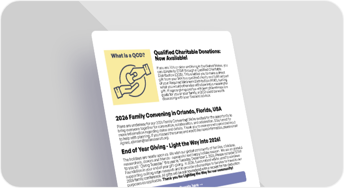 I f y o u a r e 7 0 o r o l d e r a n d l i v i n g i n t h e U n i t e d S t a t e s , y o u c a n d o n a t e t o S T A R t h r o u g h a Q u a l i f i e d C h a r i t a b l e D i s t r i b u t i o n ( Q C D ) . T h i s e n a b l e s y o u t o m a k e a d i r e c t g i f t f r o m y o u r I R A t o a q u a l i f i e d c h a r i t y a n d f u l f i l l a l l / p a r t o f y o u r R e q u i r e d M i n i m u m D i s t r i b u t i o n ( R M D ) , t u r n i n g w h a t y o u w o u l d o t h e r w i s e w i t h d r a w i n t o a m e a n i n g f u l g i f t . I f l e g a c y g i v i n g a n d t a x - e f f i c i e n t p h i l a n t h r o p y a r e g o a l s f o r y o u o r y o u r f a m i l y , a Q C D c o u l d b e w o r t h d i s c u s s i n g w i t h y o u r f i n a n c i a l a d v i s o r . Q u a l i f i e d C h a r i t a b l e D o n a t i o n s : N o w A v a i l a b l e ! P l a n s a r e u n d e r w a y f o r o u r 2 0 2 6 F a m i l y C o n v e n i n g ! W e ' r e e x c i t e d f o r t h e o p p o r t u n i t y t o b r i n g e v e r y o n e t o g e t h e r f o r c o n n e c t i o n , c o l l a b o r a t i o n , a n d c e l e b r a t i o n . S t a y t u n e d f o r m o r e i n f o r m a t i o n r e g a r d i n g d a t e s a n d d e t a i l s . T h a n k y o u t o e v e r y o n e w h o p r o v i d e d i n p u t t o h e l p w i t h p l a n n i n g . I f y o u m i s s e d t h e s u r v e y a n d w o u l d l i k e m o r e i n f o r m a t i o n , p l e a s e e m a i l A g n e s , a j e n s e n @ s a l l a r e s e a r c h . o r g . 2 0 2 6 F a m i l y C o n v e n i n g i n O r l a n d o , F l o r i d a , U S A T h e h o l i d a y s a r e n e a r l y u p o n u s . W e w i s h o u r g l o b a l c o m m u n i t y o f f a m i l i e s , c l i n i c i a n s , r e s e a r c h e r s , d o n o r s a n d f r i e n d s - a p e a c e f u l a n d h a p p y h o l i d a y s e a s o n . W e a r e s o g r a t e f u l t o y o u a l l ! " G i v i n g T u e s d a y " t h i s y e a r i s T u e s d a y , D e c e m b e r 2 , 2 0 2 5 . P l e a s e c o n s i d e r S T A R F o u n d a t i o n i n y o u r e n d o f y e a r g i f t - g i v i n g . I n 2 0 2 6 , f u n d s r a i s e d w i l l b e u s e d t o c o n t i n u e s u p p o r t i n g c u t t i n g e d g e r e s e a r c h a n d t o p r o v i d e s c h o l a r s h i p s t o f a m i l i e s t o t r a v e l t o o u r 2 0 2 6 f a m i l y c o n f e r e n c e . A l l g i f t s w i l l b e a c k n o w l e d g e d w i t h a r e c e i p t f o r t a x d e d u c t i o n p u r p o s e s a s a p p l i c a b l e . T h a n k y o u f o r L i g h t i n g t h e W a y f o r o u r c o m m u n i t y ! E n d o f Y e a r G i v i n g - L i g h t t h e W a y i n t o 2 0 2 6 ! S t a y I n T o u c h ! W e w o u l d l o v e t o f e a t u r e S T A R f a m i l y u p d a t e s f r o m a r o u n d t h e g l o b e . C o n t a c t a j e n s e n @ s a l l a r e s e a r c h . o r g f o r m o r e i n f o r m a t i o n . C o n t a c t u s : i n f o @ s a l l a r e s e a r c h . o r g S T A R F o u n d a t i o n P . O . B o x 1 1 5 G o l d e n s B r i d g e , N e w Y o r k