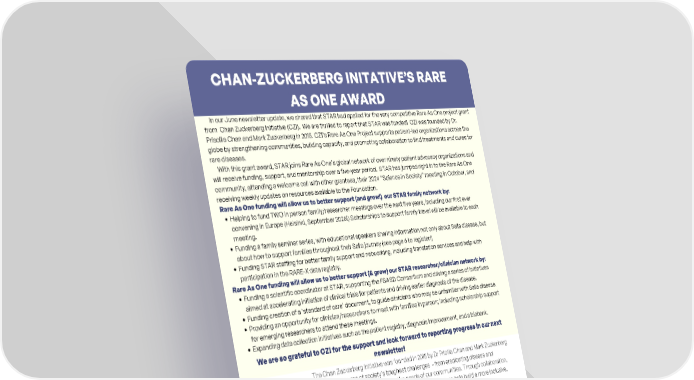 CHAN-ZUCKERBERG INITATIVE’S RARE AS ONE AWARD In our June newsletter update, we shared that STAR had applied for the very competitive Rare As One project grant from Chan Zuckerberg Initiative (CZI). We are thrilled to report that STAR was funded! CZI was founded by Dr. Priscilla Chan and Mark Zuckerberg in 2015. CZI9s Rare As One Project supports patient-led organizations across the globe by strengthening communities, building capacity, and promoting collaboration to find treatments and cures for rare diseases. With this grant award, STAR joins Rare As One9s global network of over ninety patient advocacy organizations and will receive funding, support, and mentorship over a five-year period. STAR has jumped right in to the Rare As One community, attending a welcome call with other grantees, their 2024