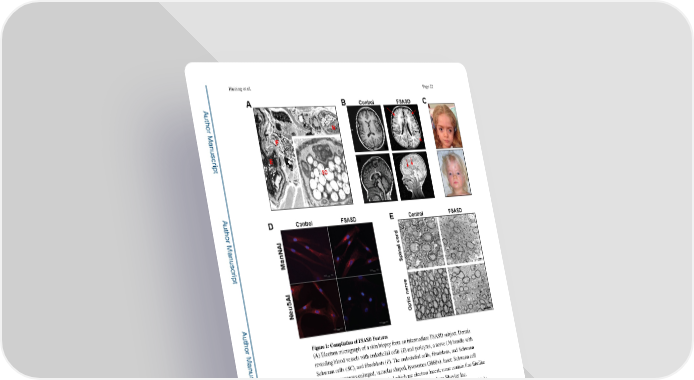 Huizing et al. Page 22 A uthor Man uscr ipt A uthor Man uscr ipt A uthor Man Figure 1: Compilation of FSASD Features (A) Electron micrograph of a skin biopsy from an intermediate FSASD subject. Dermis uscr revealing blood vessels with endothelial cells (E) and pericytes, a nerve (N) bundle with ipt Schwann cells (SC), and fibroblasts (F). The endothelial cells, fibroblasts, and Schwann cells have numerous enlarged, vacuolar shaped, lysosomes (3860×). Inset: Schwann cell containing enlarged lysosomes, most of which are electron lucent; some contain fine fibrillar material (17,550×). Image derived from [17], with permission from Elsevier Inc. (B) Brain MRI of the same intermediate FSASD subject as in (A) at 10 months of age (right images) compared to age-matched control images (left). Top: Axial T1-weighted, Bottom: A Sagittal midline T1-weighted. Note widespread and profound hypomyelination throughout uthor Man the cerebral and cerebellar hemispheres and small corpus callosum (red arrows). FSASD images derived from [17], with permission from Elsevier Inc. (C) Coarse facial features of FSASD include hypertelorism, flat-bridged nose, depressed nasal bridge, broad nasal tip, long philtrum, broad forehead/brachycephaly, depicted in a 4.5 uscr year old girl [10] and a 30-month old girl [17], both presenting with intermediate FSASD. ipt Images with permission from Elsevier Inc. Neurosci Lett. Author manuscript; available in PMC 2021 June 11.