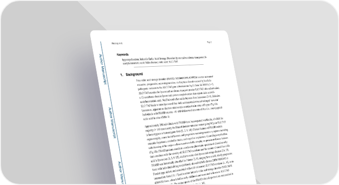 Huizing et al. Page 2 A Keywords uthor Man hypomyelination; Infantile Sialic Acid Storage Disorder; lysosomal membrane transporter; N- acetylneuraminic acid; Salla disease; sialic acid; SLC17A5 uscr 1. Background ipt Free sialic acid storage disorder (FSASD; MIM#604369; #269920) is a rare autosomal recessive, progressive, neurodegenerative, multisystem disorder caused by bi-allelic pathogenic variants in the SLC17A5 gene (chromosome 6q13; Gene ID 26503) [1–3]. SLC17A5 encodes the lysosomal membrane transport protein SLC17A5 (also called sialin), a 12-membrane domain lysosomal, proton-coupled carrier that exports sialic acid (N- acetylneuraminic acid, Neu5Ac) and other acidic hexoses from lysosomes [3–8]. Defective A uthor Man SLC17A5 leads to intra-lysosomal free sialic acid accumulation and enlarged ‘vacuolar’ lysosomes, apparent on electron microscopic examination in some cell types (Fig 1A). Individuals with FSASD excrete ~10–100-fold normal amounts of free (i.e., unconjugated) sialic acid in urine (Table 1). uscr Approximately 200 individuals with FSASD have been reported worldwide, of which the ipt majority (> 160 cases) carry the Finnish founder missense variant p.Arg39Cys in SLC17A5 in homozygous or heterozygous form [1, 2, 9, 10]. Clinical features of FSASD include organomegaly, coarse facial features and progressive neurodegenerative symptoms including muscular hypotonia, cerebellar ataxia, and cognitive impairment. Central hypomyelination with thinning of the corpus callosum and cerebellar atrophy are prominent disease features (Fig 1B). FSASD patients manifest a continuous phenotypic spectrum of clinical severity A that correlates with the severity of SLC17A5 mutations and the amount of stored free sialic uthor Man acid in lysosomes [1, 3, 9–13], similar to some other lysosomal storage diseases [14, 15]. FSASD was historically classified in 3 forms [2, 9], ranging from a mild, slowly progressive form with individuals living to adulthood, also called Salla disease [MIM #604369] or Finnish type sialuria and associated with mild (missense) SLC17A5 mutations [1, 16], to an uscr intermediate form [10, 17] and a severe infantile sialic acid storage disorder (ISSD; MIM ipt #269920) form, often lethal in early childhood and associated with severe SLC17A5 mutations [18, 19]. The main aspects of the FSASD clinical spectrum are summarized in Table 1 and detailed in the literature [1–3, 10, 11, 19]. Although sialic acid metabolism, membrane transport, and lysosomal biology have been extensively studied, the pathobiology of FSASD remains poorly understood. Moreover, FSASD is likely underdiagnosed; known patients have experienced a diagnostic delay [2, A uthor Man 11] due to the rarity of the disorder, non-specific clinical symptoms and absence of routine urine sialic acid testing. There is no approved therapy for FSASD, nor are there clinical trials for FSASD listed on clinicaltrials.gov (November 2020). No drug intended to treat FSASD has been granted orphan designation (https://www.accessdata.fda.gov/scripts/ uscr opdlisting/oopd/). ipt The small population of FSASD patients has hindered industry from investing in the pre- clinical and clinical studies necessary to develop therapies [20, 21]. Recently, however, Neurosci Lett. Author manuscript; available in PMC 2021 June 11.